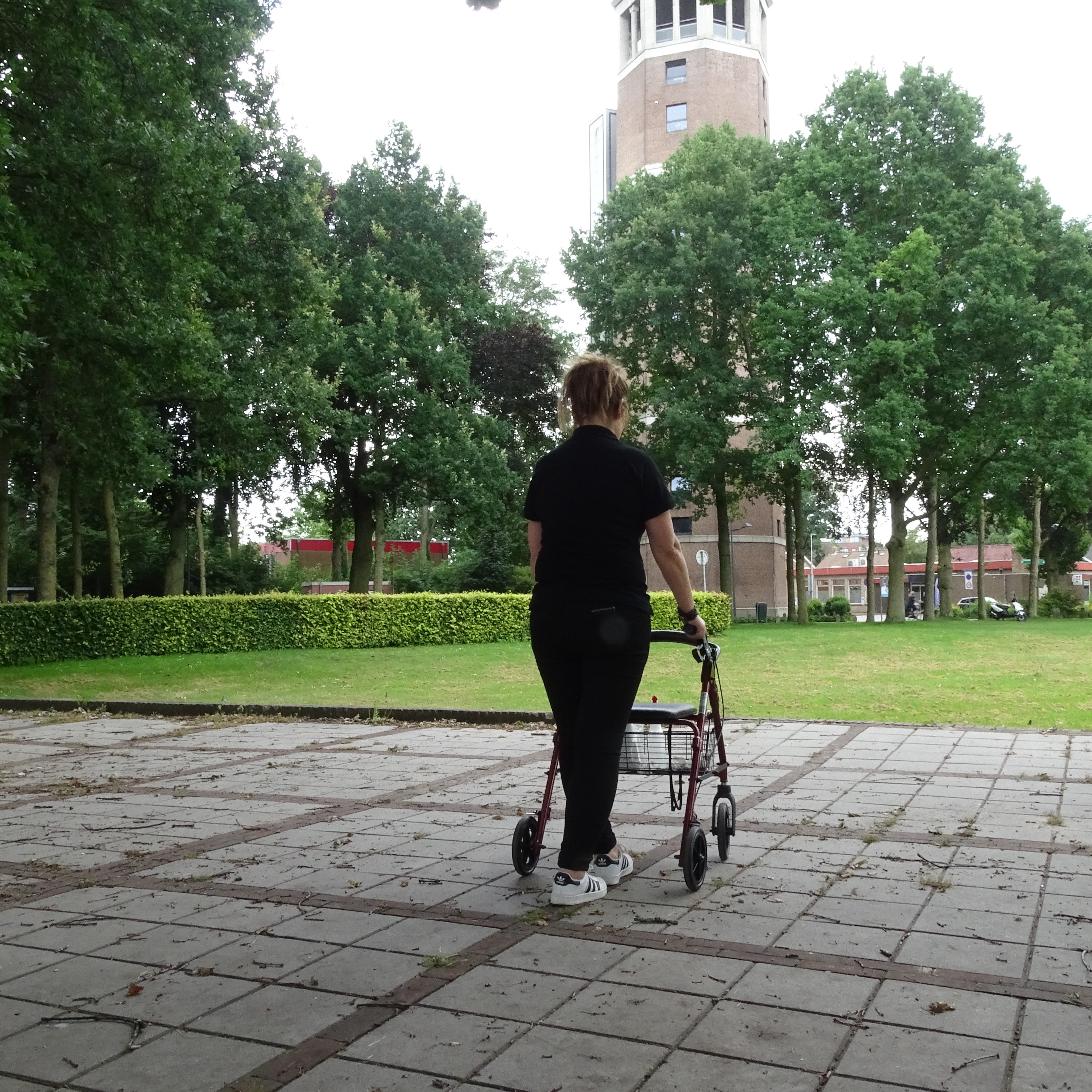 Houd de rollator vast en loop in een lijn, voetje voor voetje, over de smalle tegels (klinkers). Hoe breder de tegels, hoe makkelijker het wordt. Loop 4 keer heen en weer.
