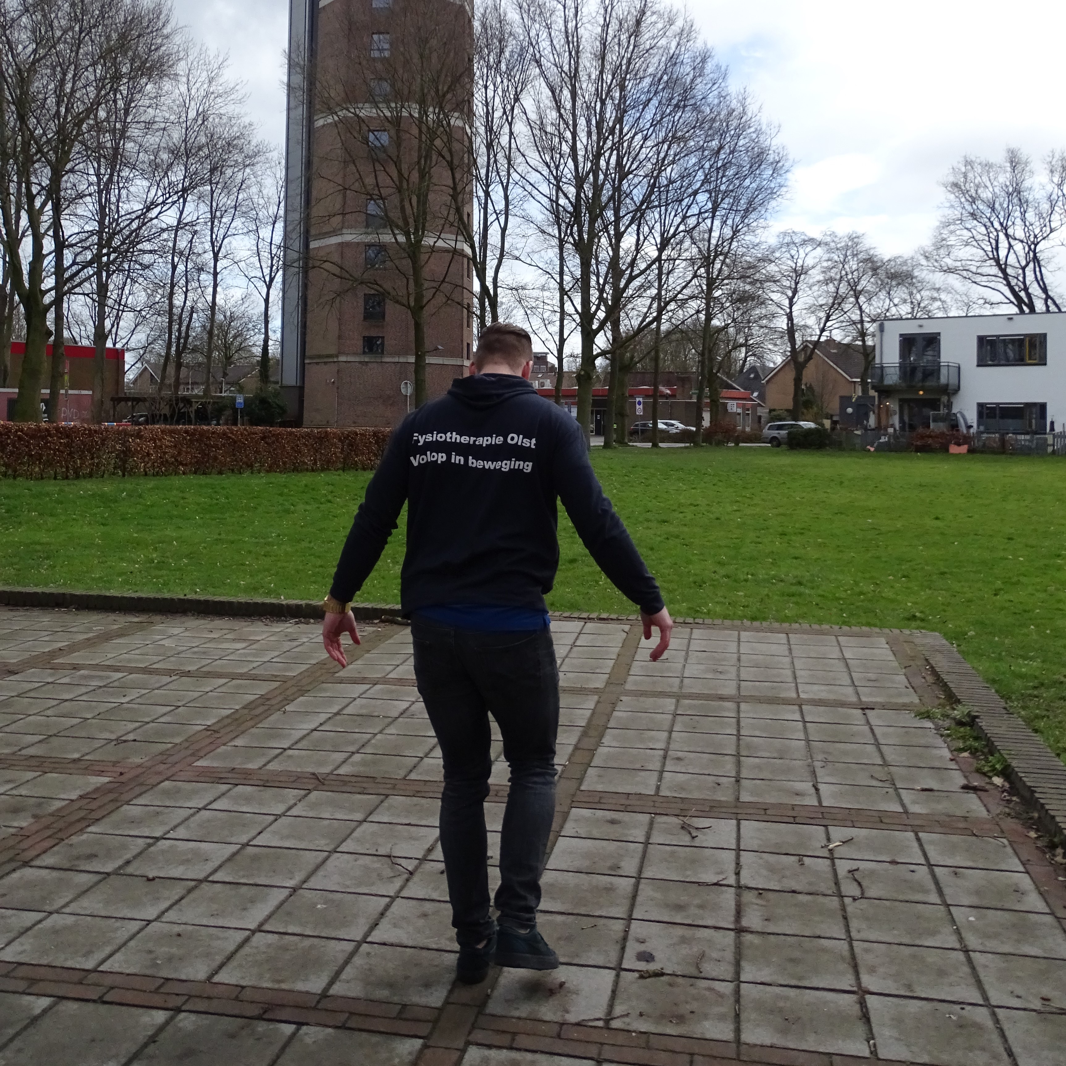 Loop achterwaarts, voetje voor voetje, over de brede of de smalle tegels (klinkers). Daag jezelf uit. Loop 4 keer en weer.